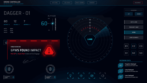 Sci-Fi UI App for monitoring and controlling Arduino-based drone remotely.